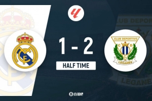 半场结束,皇马暂1-2莱加内斯。